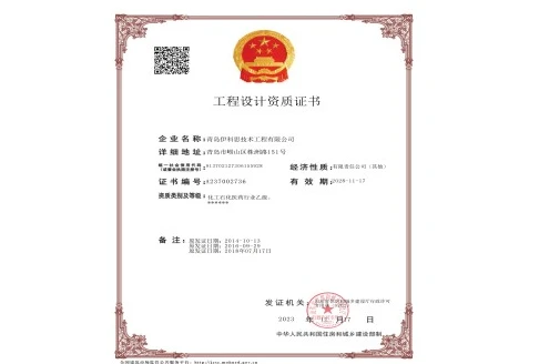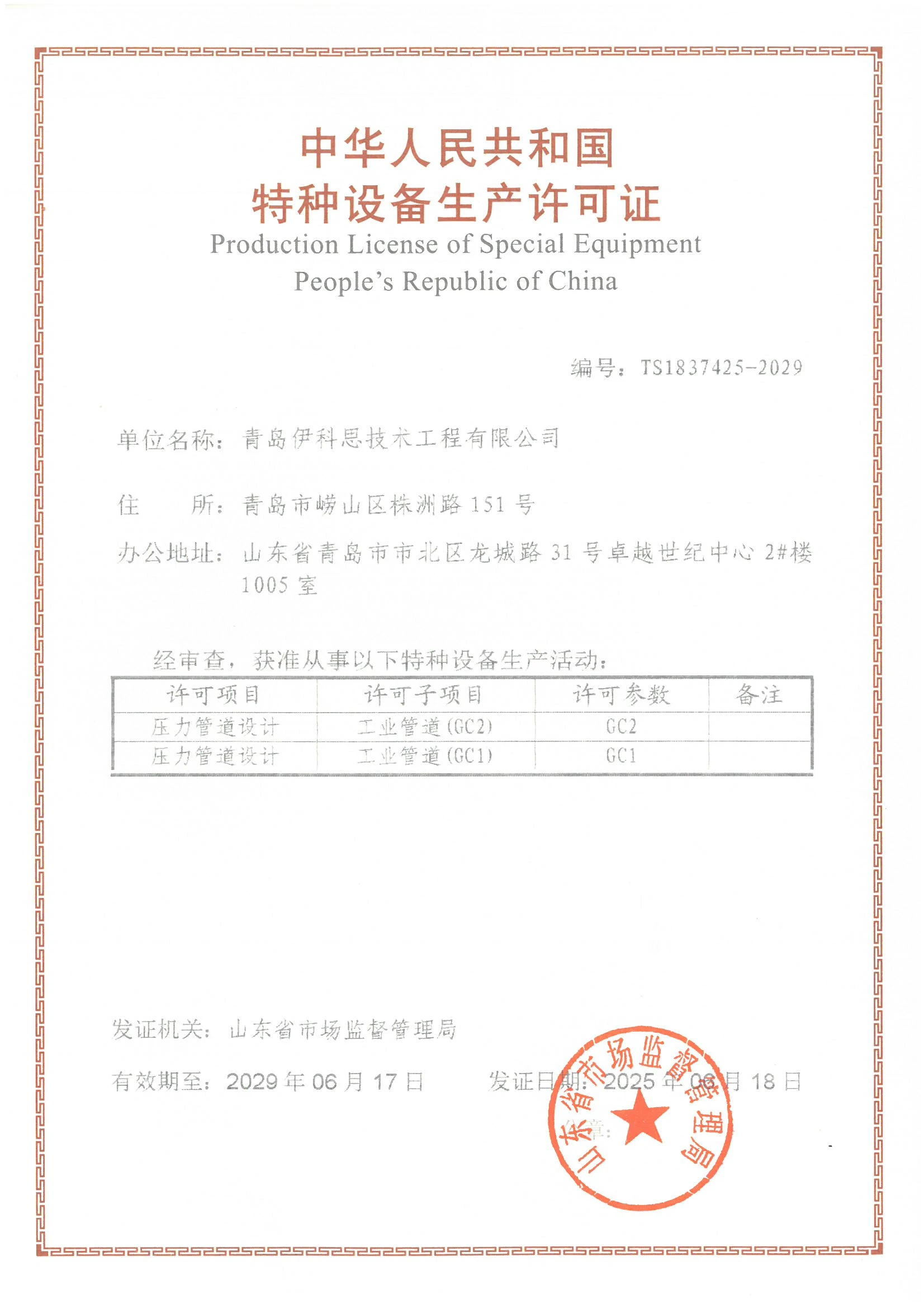 - Production License for "Pressure Pipeline Design" of Special Equipment of the People's Republic of China -