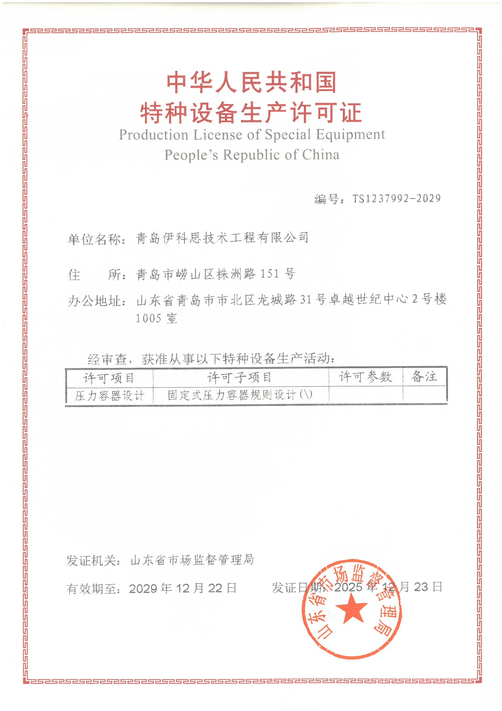 - Production License for "Pressure Vessel Design" of Special Equipment in the People's Republic of China -